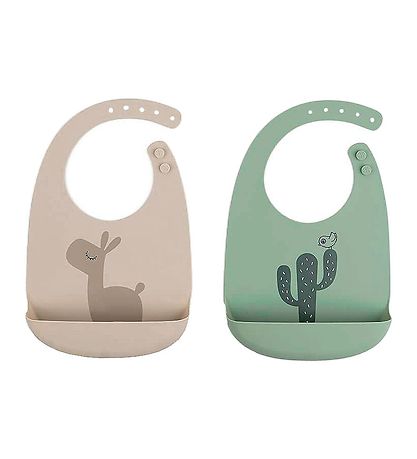 Smart Done by deer 턱받이 실용적인 2개입 으로 판매되며, 밝은 녹색 하나와 베이지색 하나가 있습니다. 한 쪽에는 앞에 큰 라마가 있고, 다른 쪽에는 큰 선인장이 있습니다.
