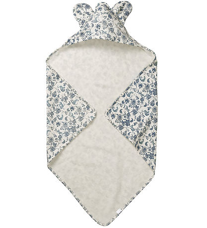 흰색의 Elodie Details 아기용 타올입니다. 짙은 녹색으로 세부적으로 프린트 있고 후드에 큰 귀가 달려 있습니다.