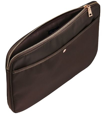 Fan Palm 컴퓨터 슬리브는 큰 칸 하나로 구성되어 있으며, 상단은 금색 지퍼로 열립니다. 가방 바깥쪽에는 금색 스냅 버튼으로 닫는 오픈 포켓이 있습니다. 소매 패딩이 좋습니다.