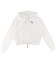 왼쪽 가슴에 ' Fila (휠라) '라는 이름이 수놓아진 흰색 스마트 Fila (휠라) 후드티.