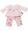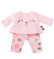 분홍색 테리 천으로 만든 점프 점프수트 와 회색 소매, 가슴 부분으로 구성된 스마트 Götz (괴츠) 인형 옷. 가슴에는 귀여운 고양이 귀와 검은 점이 있는 예쁜 리본이 달려 있습니다. 비니 는 회색이고 점과 줄무늬가 있으며 귀는 검은색입니다.