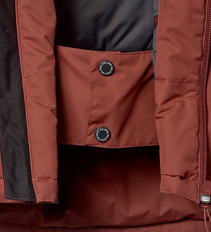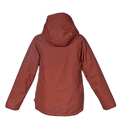 Nice Isbjörn of Sweden 겨울 재킷 (마룬 색상). 겨울 재킷 에는 왼쪽 가슴과 후드에 회색 로고가 프린트되어 있고, 허리 아랫부분과 오른쪽 어깨에는 멋진 반사 프린트가 있습니다.