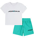 티셔츠 와 반바지 로 구성된 스마트 Jordan 반바지 세트입니다. 티셔츠 짙은 파란색이고 앞면에 흰색과 밝은 파란색으로 큰 로고가 있습니다. 반바지 는 밝은 파란색이고 왼쪽 바지 다리 아랫부분에 흰색과 파란색 로고가 인쇄되어 있습니다.
