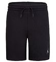 검은색의 멋진 Jordan 스웨트 반바지입니다. 왼쪽 바지 아랫부분에는 흰색 로고가 자수로 새겨져 있습니다.