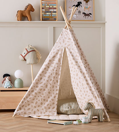 Kids Concept (키즈컨셉) 플레이 텐트는 설치와 해체가 간편합니다. 티피처럼 생긴 멋진 모양이 특징입니다. 아이들이 자신만의 아늑한 공간을 만들어 줄 수 있는 놀이 공간이나 아이들 방에 안성맞춤입니다. 한쪽에는 아래쪽과 가운데에 끈을 묶어 고정할 수 있는 구멍이 있습니다.
