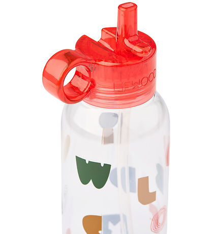투명한 트리탄 플라스틱으로 만든 고급 Liewood (리우드) 물병 으로, 다양한 모티브가 화려하게 프린트 있으며 빨간색 뚜껑이 달려 있습니다.
