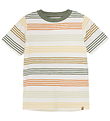 어깨 부분에 섬세한 주름 장식이 들어간 밝은 분홍색의 짧은 소매가 달린 아름다운 Minymo (미니모) 티셔츠 입니다. 티셔츠 에는 "FLOWER POWER PRETTY"라는 텍스트가 장식적으로 프린트 되어 있으며, 주변에는 다채로운 꽃과 화려한 스팽글이 장식되어 있습니다. 일상 활동에 적합합니다.