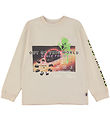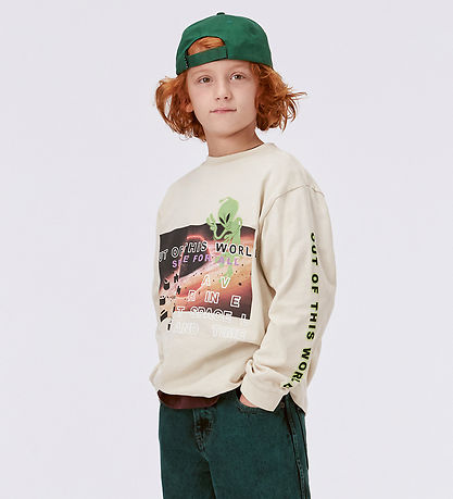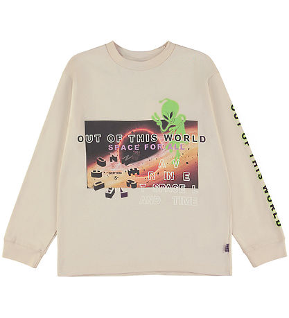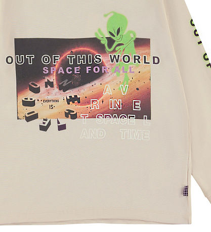 앞면에 다채로운 칸 핀트가 있고 왼쪽 소매에 "OUT OF THIS WORLD"라는 텍스트가 있는 베이지색의 멋진 Molo (몰로) 블라우스 입니다.