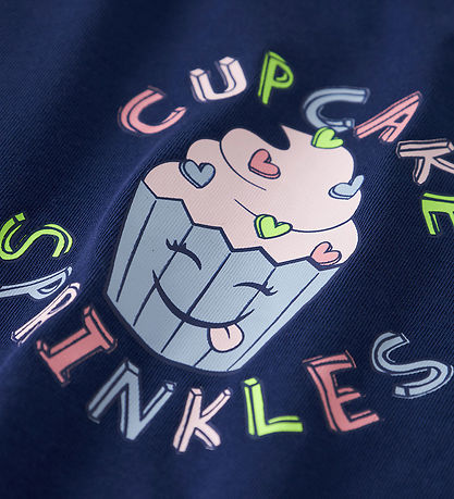 짙은 네이비 블루 색상의 매력적인 긴소매 네임 블라우스 Name It (네임 잇). 블라우스 앞면에는 " CupCake Sprinkles"라는 문구와 CupCake 일러스트가 컬러풀하게 프린트 되어 있습니다. 라운드 네크라인이 심플한 느낌을 더합니다.