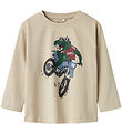 모래색 톤의 긴 소매가 달린 아름다운 Name It (네임 잇) It 블라우스. 블라우스 앞면에 "COOL"이라는 텍스트가 적힌 오토바이를 탄 공룡의 재미있는 프린트 로 장식되어 있습니다.
