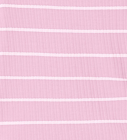 분홍색의 귀여운 Name It (네임 잇) It 보디수트, 흰색의 좁은 가로 줄무늬가 들어가 있으며, 아름다운 리브 구조가 특징입니다.