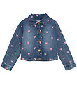 밝은 파란색의 Cool Name It (네임 잇) It 데님 재킷입니다. 가슴 포켓에는 핑크색 자수 리본 두 개가 달려 있습니다. 오른쪽 어깨 뒷면에는 핑크색 자수 텍스트가 있습니다. 데님 재킷은 멋진 칼라와 앞면에 연속적인 스냅 버튼이 특징입니다. 소매 부분에 스냅 버튼이 달린 긴 소매 디자인이며, 앞면에는 두 개의 포켓이 있습니다. 데님 재킷의 밑단은 양옆으로 올라갑니다.