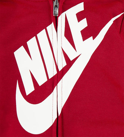 Nike (나이키) 가디건 빨간색이며 앞면에 커다란 흰색 로고가 프린트되어 있습니다. 부드러운 후드와 앞면 전체 길이의 지퍼가 특징입니다. 소매와 허리 부분에 골지 처리된 긴소매 디자인입니다.