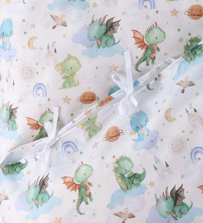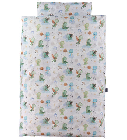 용, 성, 구름, 별, 행성이 전체적으로 화려하게 프린트된 흰색의 귀여운 Nørgaard Madsens 침구.