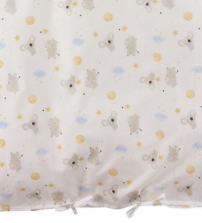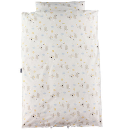 밝은 파란색 구름, 노란색 별과 달, 회색 코알라와 하마가 그려진 귀여운 전면 프린트가 있는 흰색의 사랑스러운 Nørgaard Madsens 침구.