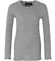 블라우스 긴 소매와 둥근 목선에 얇은 레이스 가장자리가 특징입니다. 블라우스 아랫단과 손목 부분에 물결 모양/주름 모양의 디테일이 들어가 있어 귀여운 느낌을 줍니다.