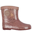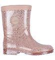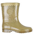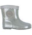 샤프트 바깥쪽에 회색 원형 로고 배지가 달린, 은색 반짝이가 들어간 세련된 Sofie Schnoor (소피슈누어) 레인부츠.