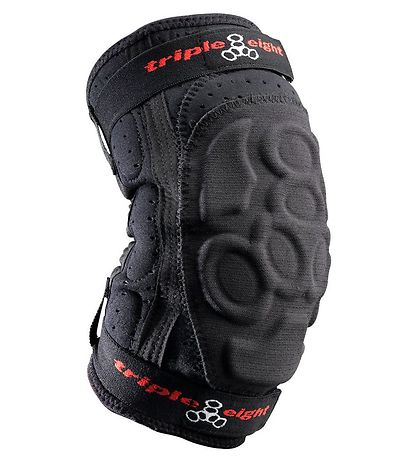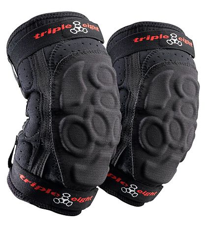 앞면에 검은색의 큰 Triple Eight Triple Eight 로고가 있고, 벨크로 스트랩에는 빨간색과 흰색의 작은 Triple Eight 엘보 패드입니다.