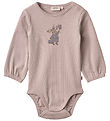 먼지가 묻은 분홍색의 아름다운 Wheat (위트) 보디수트 앞면에 나비가 프린트 되어 있고, 그 주위에 꽃 모양 원이 그려져 있습니다.