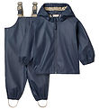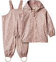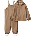 PU 소재로 만든 사랑스러운 Wheat (위트) 레인웨어, 너트 브라운 색상이며 반사 프린트가 특징입니다. 레인웨어 우비 상의 과 멜빵이 달린 우비 바지 로 구성되어 있습니다.