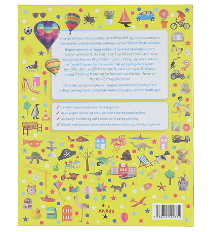 Het Alvilda boek inspireert het kind om zijn woordenschat en leesvaardigheid te ontwikkelen met de vele woorden en prachtige afbeeldingen. Het Boek bevat een breed scala aan de meest voorkomende woorden, zowel zelfstandige naamwoorden, werkwoorden als bijvoeglijke naamwoorden. Elke pagina moedigt het kind aan om veel dingen te vinden en elke pagina is verdeeld in spannende onderwerpen: ga op ontdekkingstocht tussen de wilde dieren, reis de wereld rond, kast je eigen verhaal, bezoek de stad en de boerderij, leer over kleuren, vormen en nummers, en nog veel meer.