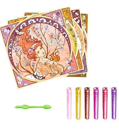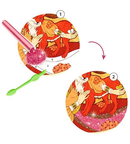 De Djeco set bestaat uit vier verschillende afbeeldingen, die versierd kunnen worden met de bijgeleverde glitter. 6 kleine bakjes met glitter in verschillende kleuren en een stokje om de glitters aan te brengen Meegeleverd. Op de verschillende pagina's is te zien hoe de glitter aangebracht kan worden.