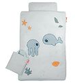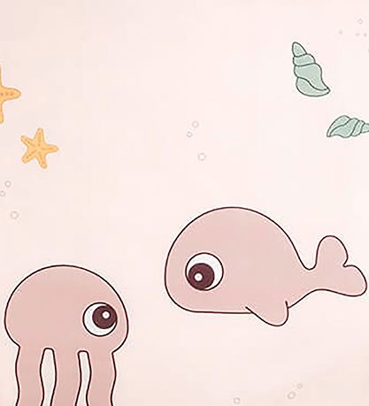 Mooi beddengoed van Done by deer in roze, met een zeemeermin en een walvis ervoor, omgeven door verschillende dingen van de zeebodem in de tinten groen en geel. Er zitten kleine belletjes op het kussen.