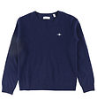 Mooi GANT wollen blouse in een diepe navy kleur met lange mouwen. Het heeft een elegant logo op de voorkant gedrukt, wat een stijlvol tintje geeft aan elke garderobe.