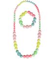 - Een ketting met kleine kralen in de kleuren geel, roze, groen en blauw