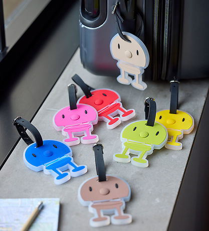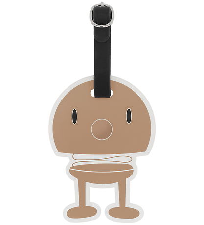 Mooi Hoptimist bagagelabel in bruin met het bekende figuurtje. Het Hoptimist bagagelabel heeft een praktisch zwart bandje en een transparant labelveld voor informatie.