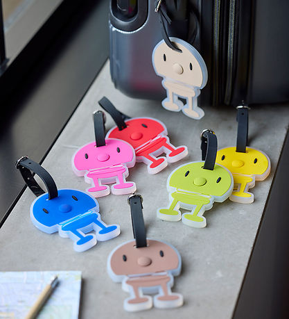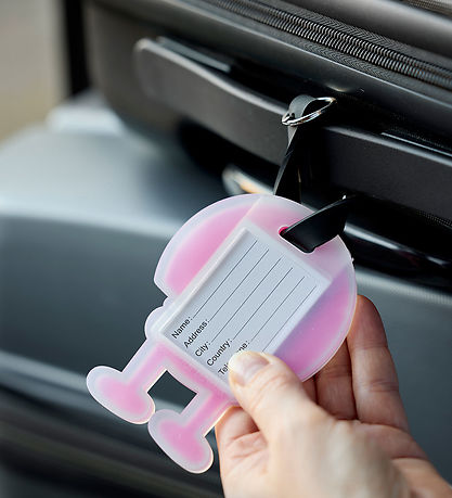 Frisse Hoptimist bagagelabel in roze met het bekende figuurtje. Het Hoptimist bagagelabel heeft een praktisch zwart bandje en een transparant label voor informatie.
