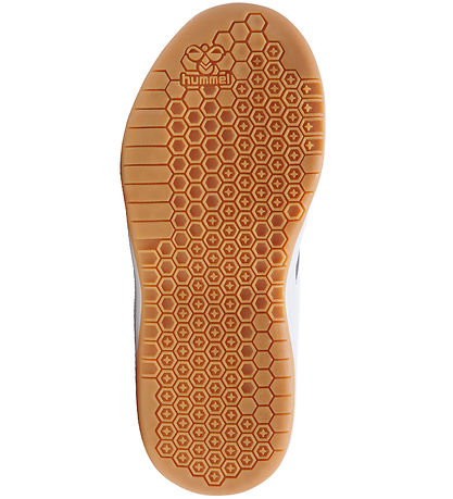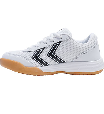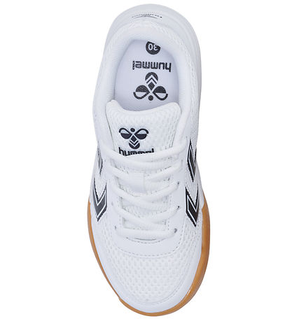 Stoere Hummel indoorsportschoenen in wit textiel en imitatie leer. Aan zowel de binnenkant als buitenkant zitten de klassieke Hummel hoeken in zwart met een wit rand, en op de hiel staat het Hummel -logo in zwart. Op de tong zit een logo applicatie in zwart.