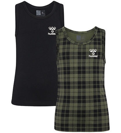 Smart Hummel onderhemden; één in een diepzwarte kleur, terwijl de andere een klassiek rasterpatroon in groen en zwart heeft. De Hummel onderhemden hebben oog voor detail met een logoprint op de voorkant.