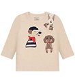 Prachtige blouse van Hust and Claire in een beige kleur met fijne strepen in blauw en tinten. De Blouse heeft een discreet label met een schip op de borst, wat een stijlvolle touch toevoegt.