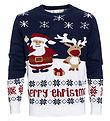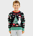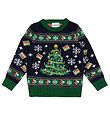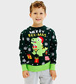 blouse Jule-Sweaters in donkergroen gebreid met lichtgroene randen, en op de voorkant staat een lichtgroen dinosaur met een kerstmuts op en met daaronder kerstcadeautjes.