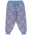 Prachtige broek van Konges Sløjd in een mooi lichtblauw tint met een charmant kersenpatroon in roze tinten. De broek heeft een zachte breistructuur, wat zorgt voor een moderne look.