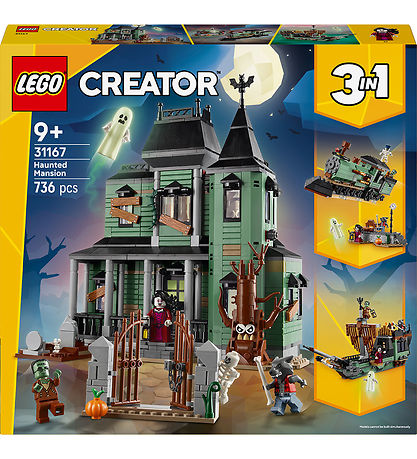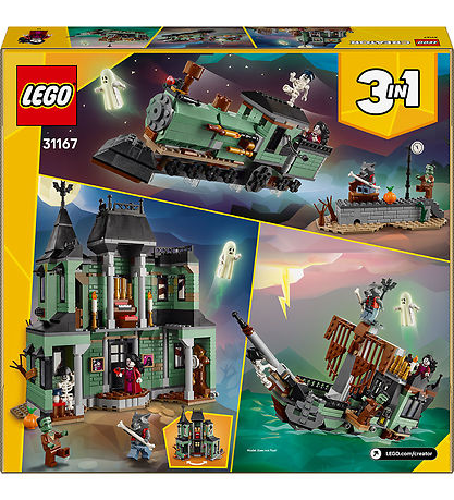 Gedetailleerde LEGO® Creator set met in totaal 736 blokken die kunnen worden samengevoegd tot een spookhuis met meerdere verdiepingen, een poort, een hout en speelfiguren. De Set is een 3-in-1 set, waarbij de onderdelen ook gebruikt kunnen worden om twee andere modellen te bouwen: een spooktrein of een piratenschip met bijbehorende details.