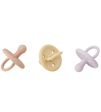 Mooie Liewood speen verkocht als 3-pack in verlichten, lightgeel en licht roze. Aan de onderkant van de ring bevindt zich een leuk, klein teddybeermotief.