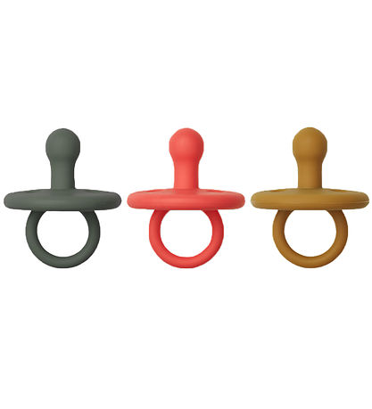 Mooie Liewood speen verkocht als 3-pack in donker, mat blauw, rood en okergeel. Aan de onderkant van de ring bevindt zich een leuk, klein teddybeermotief.