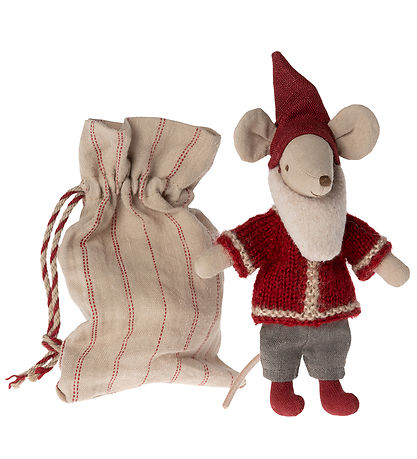 Mooi Maileg knuffel in de vorm van een beige muis verkleed als kerstman in een rood gebreide blouse, en een groot zak voor alle kerstcadeautjes meegeleverd.