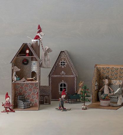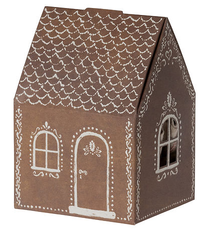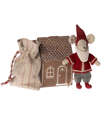De Maileg knuffel wordt geleverd in een mooi doos die eruit ziet als een peperkoekenhuisje. De Kerstman past precies in het grote peperkoekenhuisje van Maileg, waar hij door de schoorsteen naar beneden kan glijden.