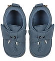Leuke Melton pantoffels in het, navy leer met een navy rand van suede langs de zool. Op de hiel zit een klein, bruin leren plaatje met de naam "Melton" erop.