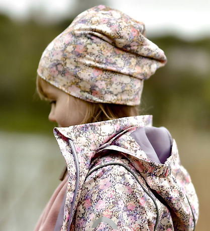 Leuke Mikk-Line muts met een leuke bloemenprint in roze, paars en beige tinten. De Muts heeft een reflecterend logo op de voorkant, wat het ontwerp een uniek tintje geeft.