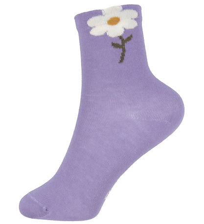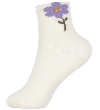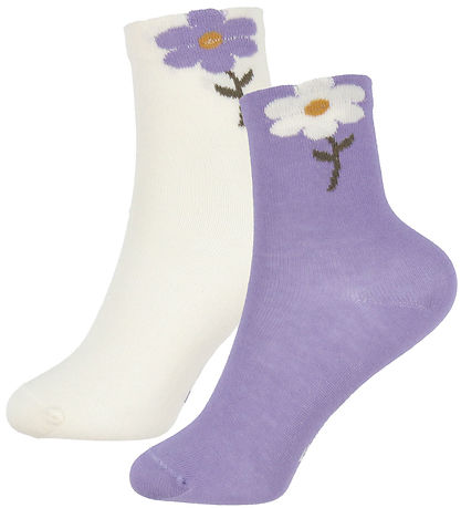 Mooie Minymo sokken in een lila met een bloemenprint op één paar. Het tweede paar is uitgevoerd in klassiek gebroken wit, wat een mooie contrast vormt met het paars paar. De Minymo sokken zijn zowel decoratief als praktisch.
