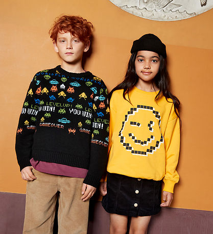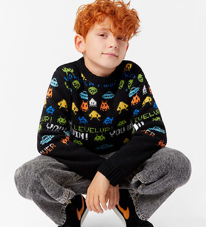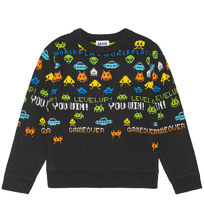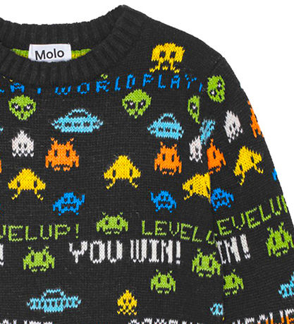 Prachtige Molo blouse in zwart gebreid met een stoer allover patroon met verschillende speelfiguren en tekst in fijne kleuren.
