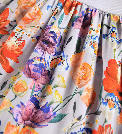 Mooi Molo jurk met een effen geribbelde top in een verlichten tint en lange mouwen. De Molo jurk heeft een rok met een kleurrijke bloemenprint in oranje, paars en blauw tinten, wat zorgt voor een levendig contrast.