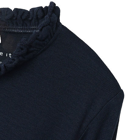 Elegante Name It blouse in donkerblauw met decoratieve ruches langs de halslijn en aan de mouwranden, voor een subtiel decoratief element. De Blouse heeft een knop en elastieksluiting boven de druppelhals.