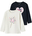 Mooie blousen van Name It, één in een lichte crèmekleur met een fijne sterrenprint in roze en goud op de voorkant. De andere in donkerblauw met een schattige print van een kat in een hart. Ze hebben lange mouwen en geven een speelse uitstraling, perfect voor elke gelegenheid.