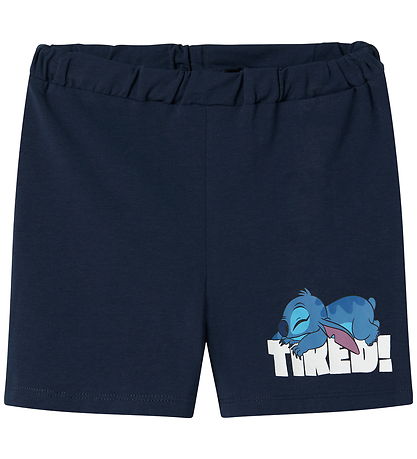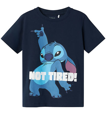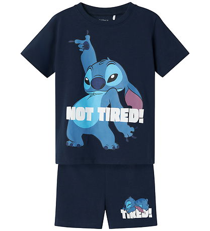 Prachtige Name It pyjama set met een t-shirt met korte mouwen in een blauw tint. T-shirt is versierd met een grote print van Stitch met de tekst "Not Tired!". De bijpassende shorts heeft een kleinere print met hetzelfde personage.