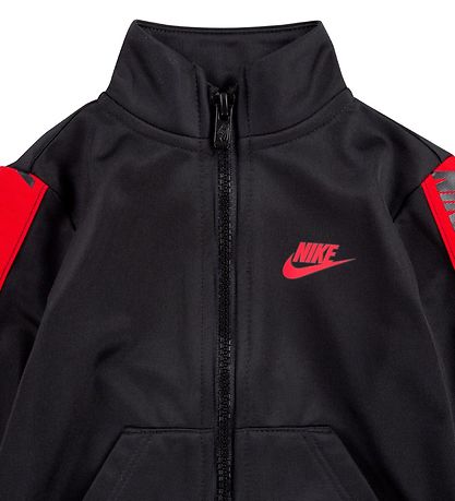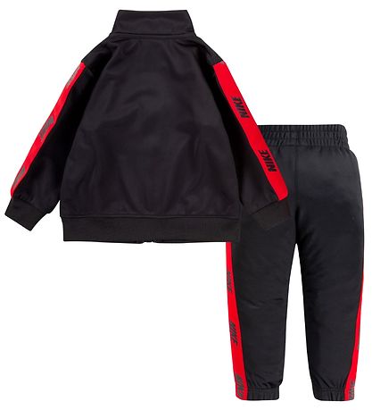 Leuke Nike trainingspak, bestaande uit een cardigan en een paar in zwart met rode broek met "Nike" prints in zwart langs de buitenkant van de mouwen en broekspijpen. Op zowel de linkerborst als het dijbeen bevinden zich rode logoprints.